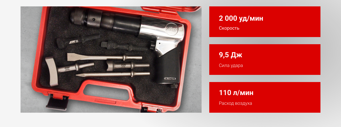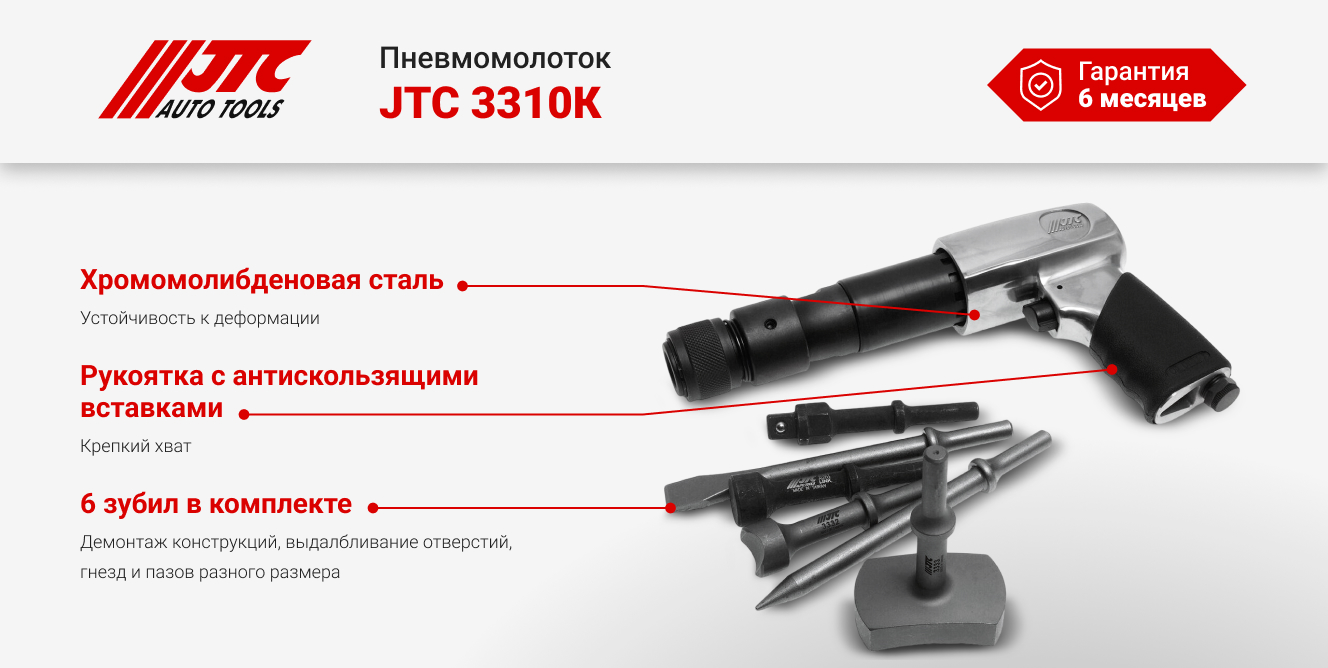 - Корпус пневмомолотка JTC с набором зубил JTC-3310K изготовлен из прочного материала;