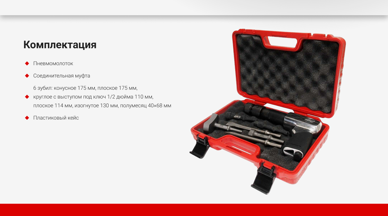 Пневмомолоток JTC с набором зубил JTC-3310K подойдет для демонтажа различных конструкций, а благодаря входящим в комплект зубилам, инструмент позволит выполнять работы по выдалбливанию отверстий, гнезд и пазов различного размера. Молоток обладает прочной конструкцией и удобной рукояткой. Изделие работает благодаря компрессору, который через шланг подает сжатый воздух в инструмент и приводит в действие ударный механизм.