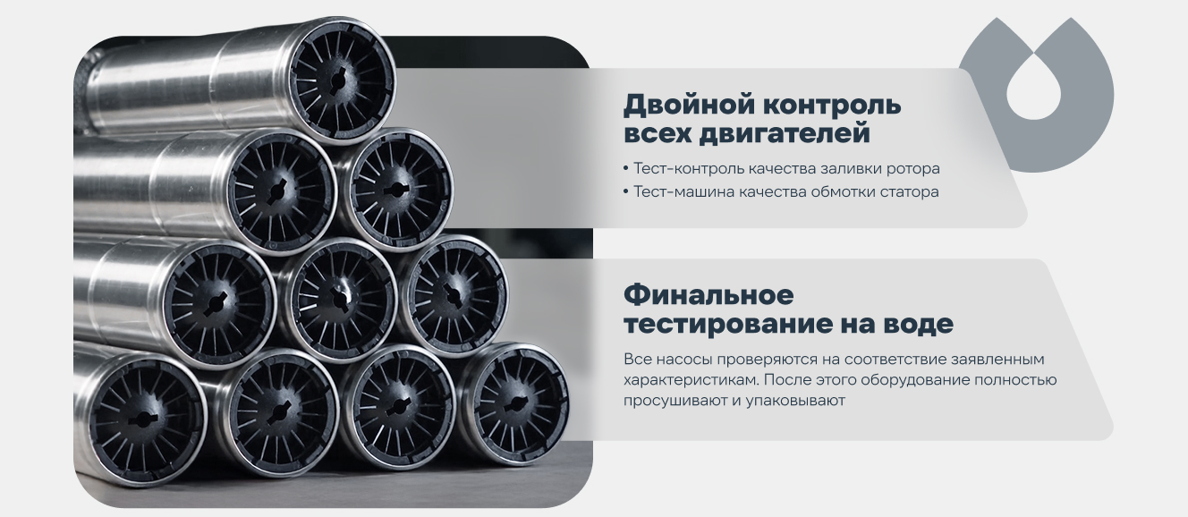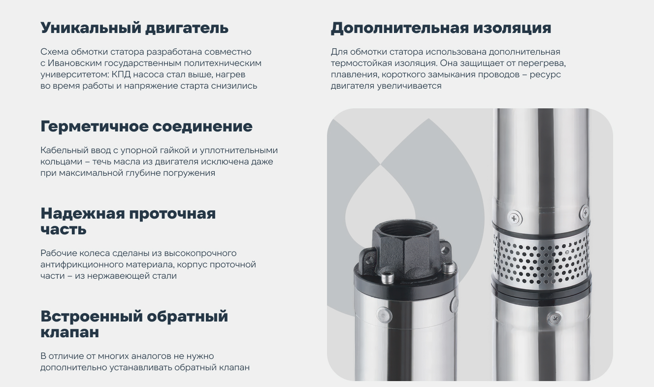 Погружной скважинный насос ECO RUS 2-45 полностью разработан в России и предназначен для подачи чистой холодной воды без абразивных веществ и волокнистых включений из скважин с внутренним диаметром не менее 98 мм, глубоких колодцев и открытых водоемов.
