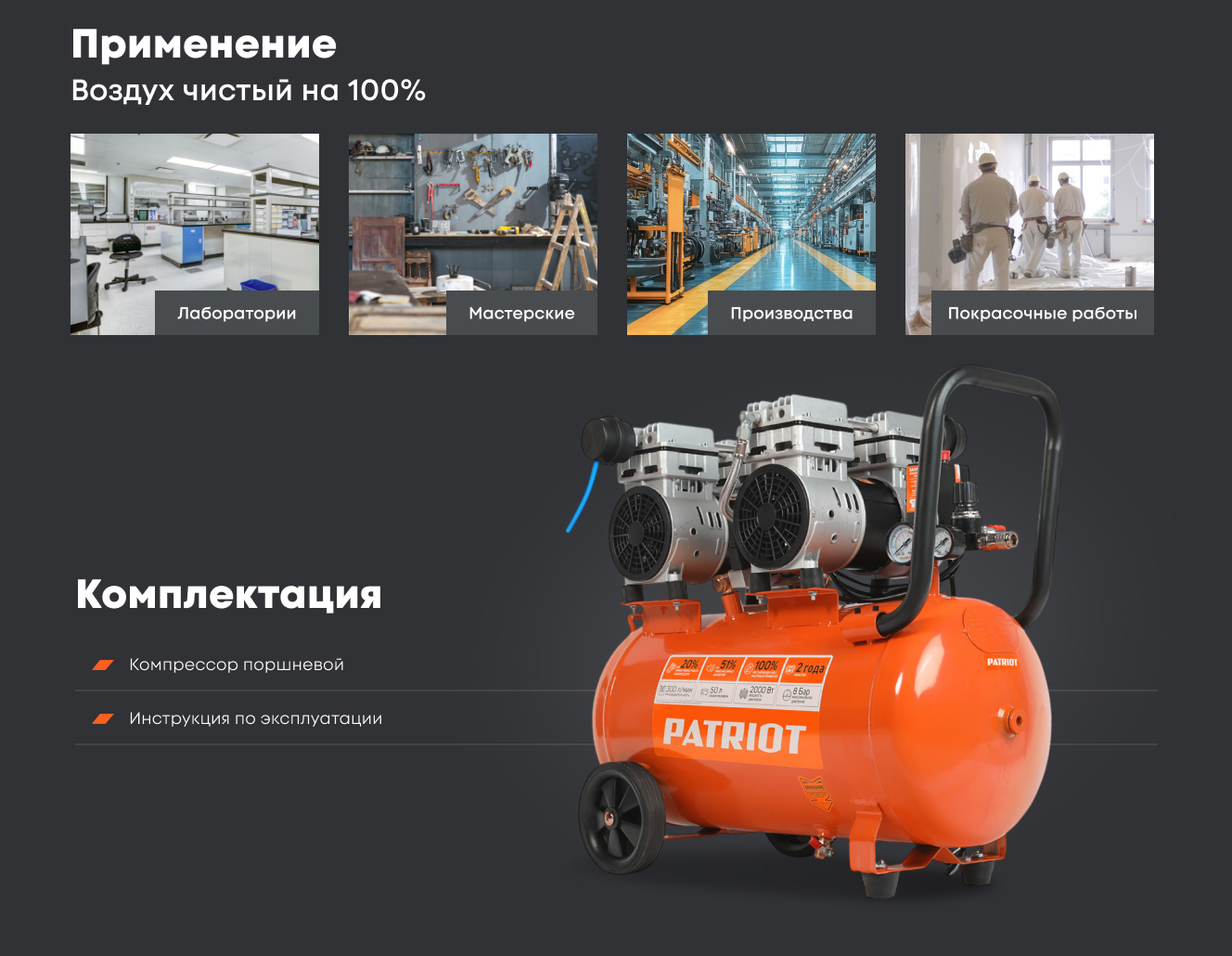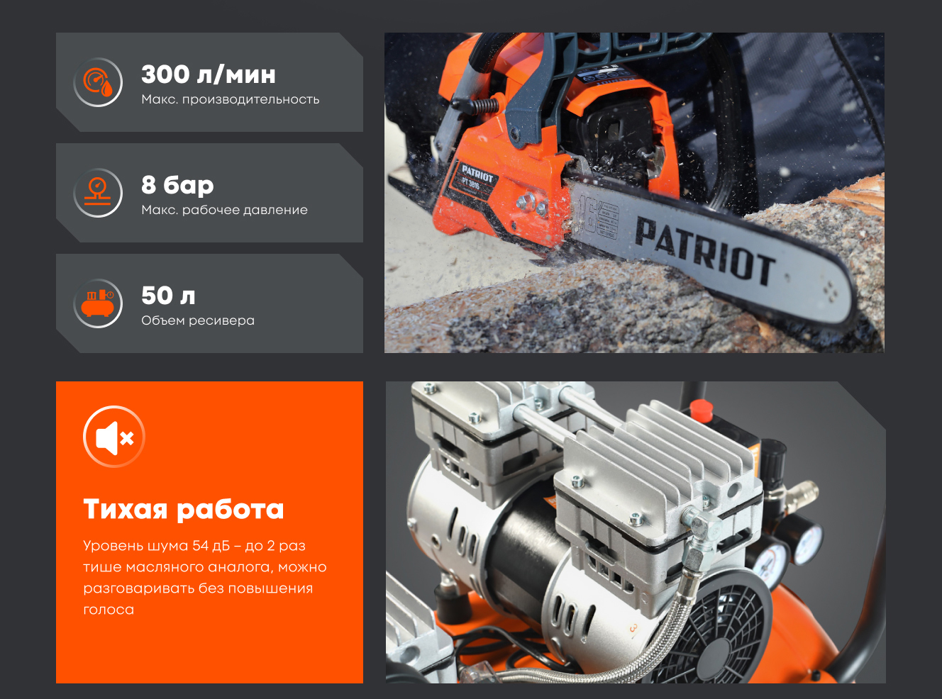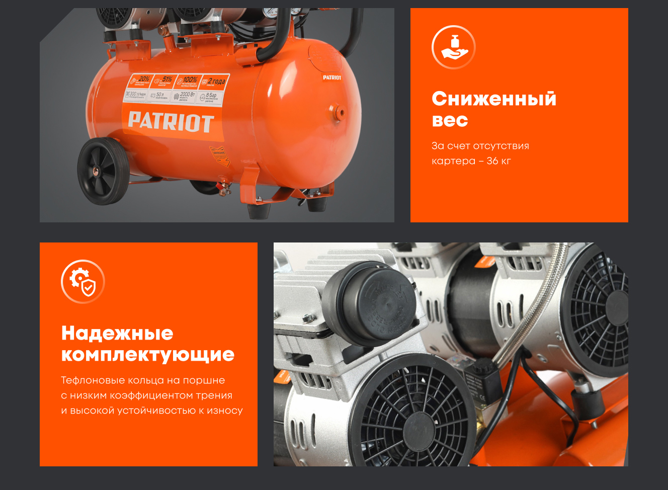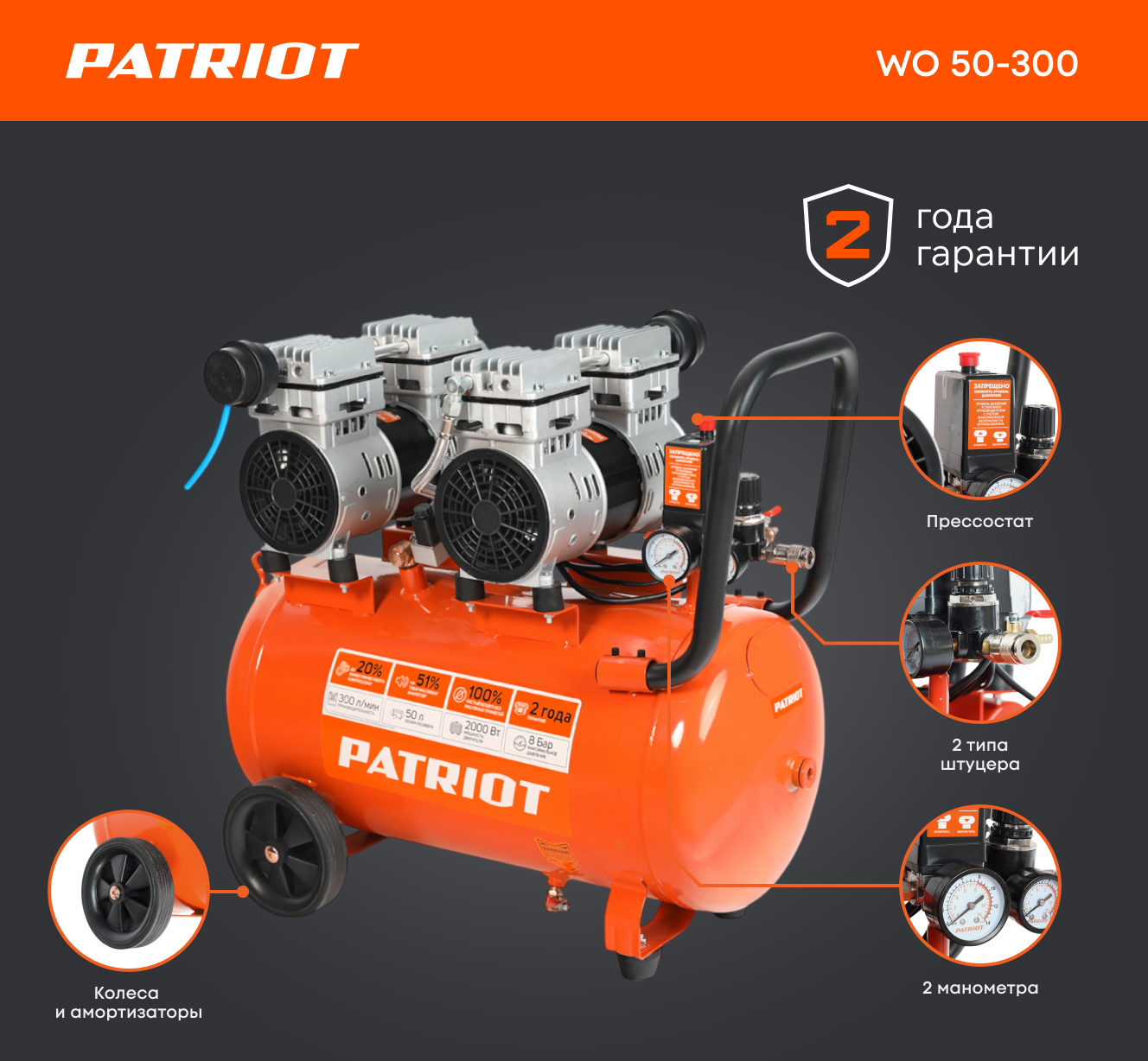 - Поршневой безмасляный компрессор PATRIOT WO 50-300 525301925 готов к работе сразу после покупки, не требует заправки маслом, а так же контроля за наличием масла и его замены