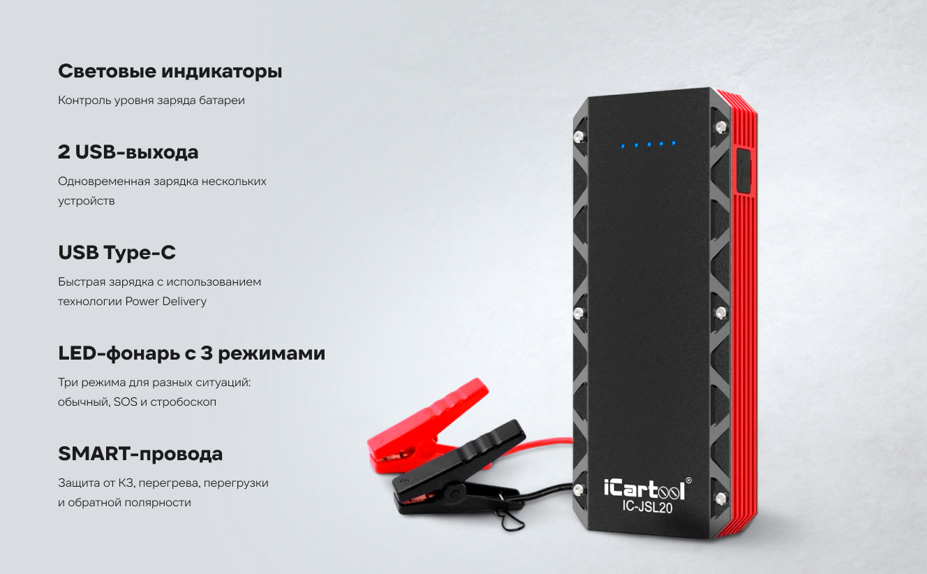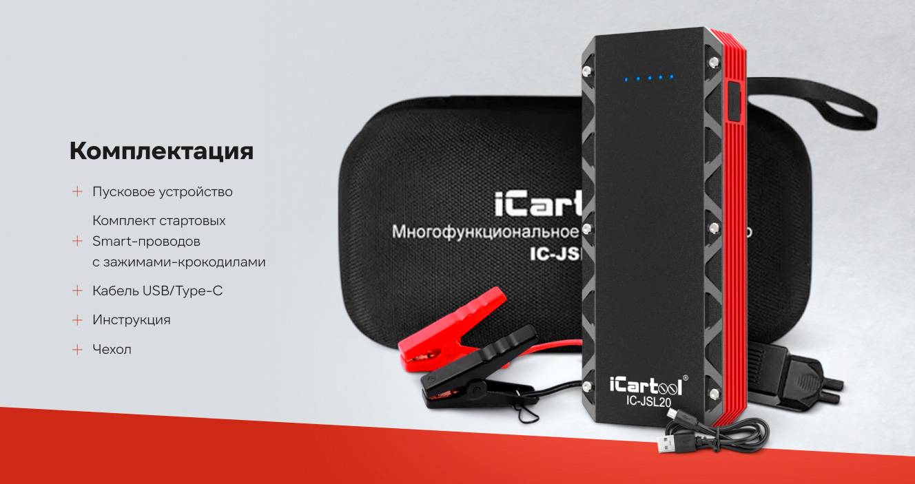Многофункциональное пусковое устройство для автомобиля iCartool IC-JSL20 представляет собой легкий, компактный, один и самых мощных в нашей линейке, современный и высокотехнологичный, а также удобный и простой в использовании гаджет, предназначенный для решения широкого спектра задач.