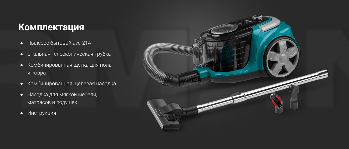 Пылесос NORMANN AVC-214 (N16013-2) - мощное устройство с циклонным фильтром и высокой мощностью всасывания. Пылесос оснащен стальной телескопической трубкой всасывания, что позволяет легко отрегулировать высоту, подходящую под Ваш рост. В комплекте есть комбинированная щетка для пола/ковра, щелевая насадка и насадка для мягкой мебели, матрацев и подушек. А большой пылесборник объёмом 3 л позволит реже производить очистку пылесоса.