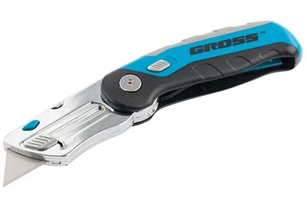Складной ремонтно-монтажный нож Gross 78882 длиной 175 мм, с трехкомпонентной рукояткой, контейнером-держателем для лезвий и 2 запасными полотнами — режущий инструмент профессионального назначения. Используется для раскройки линолеума и обоев, разрезания картона, гипсокартона, кожи и других материалов. Нож защищен от самопроизвольного раскладывания — на боковой части имеется специальный стопор, фиксирующий держатель лезвия внутри корпуса.