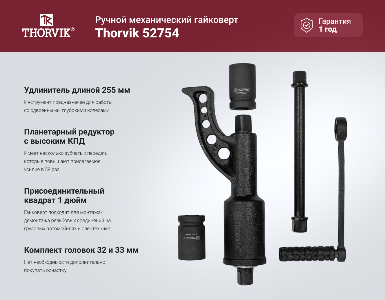 Ручной механический удлиненный гайковерт 3800 Нм и головки торцевые 32 мм, 33 мм Thorvik LSW3 52754 удобен в использовании за счет высокого передаточного отношения. Это позволяет с меньшими усилиями отвернуть гайки.