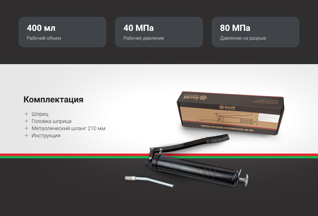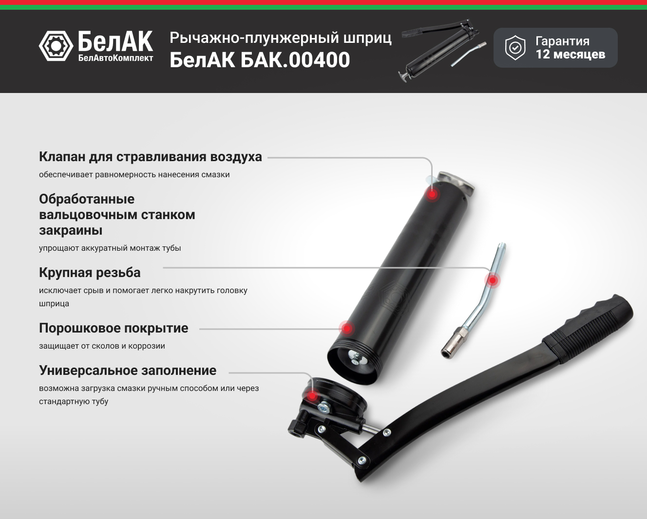 Рычажно-плунжерный шприц БелАК 400 мл БАК.00400 разработан российским производителем «БелАК», награждённым девятью национальными премиями «Автокомпонент года» и «Автоаксессуар года». Отдельная премия «Автокомпонент года» присуждена в номинации «Ручные нагнетатели смазки» за высокое качество и надежность выпускаемого инструмента для смазки узлов трения различных механизмов. Продукция «БелАК» соответствуют нормам сертификации ISO9001 и ЕАС. Шприцы защищены от подделки: на корпус каждого инструмента нанесен фирменный логотип «БелАК» методом трубной накатки.