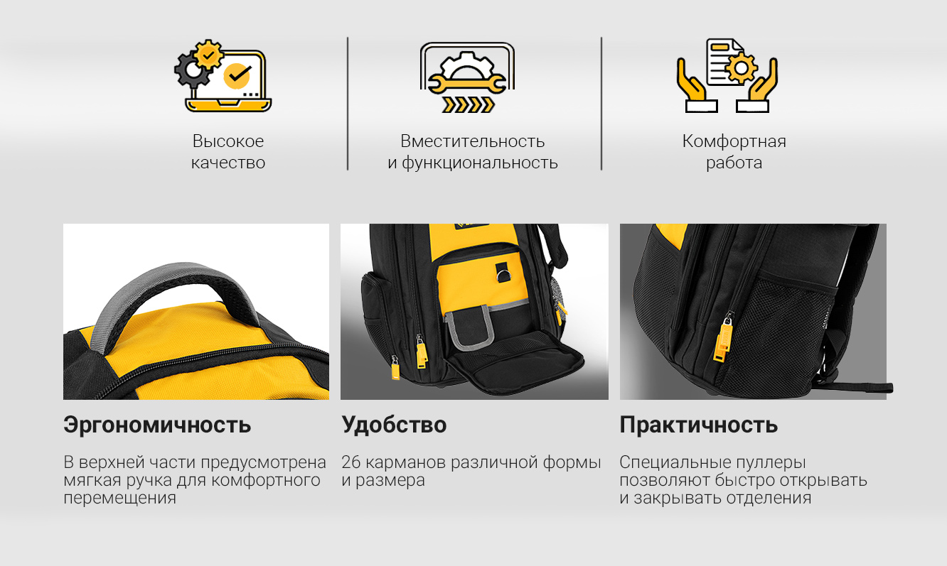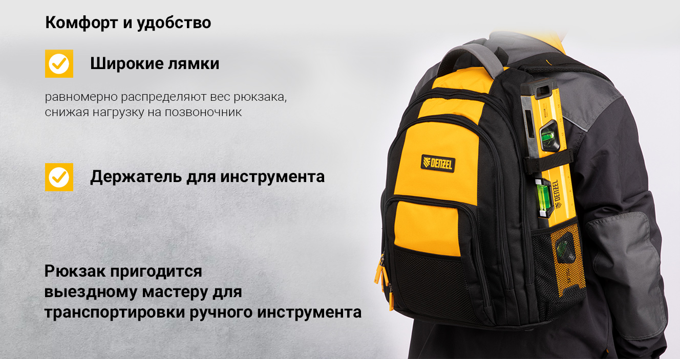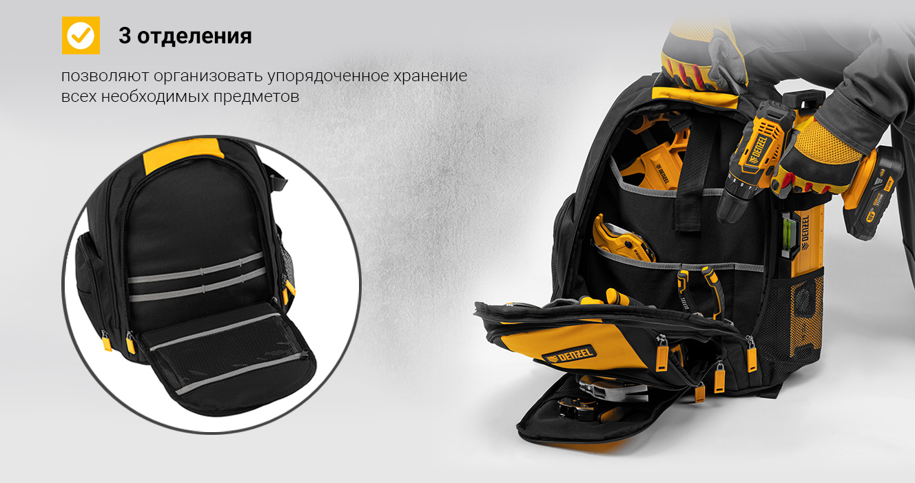 Рюкзак Denzel 90296 размером 365 х 190 х 430 мм, с 3 отделениями и 26 карманами (в том числе сетчатыми), предназначен для размещения и транспортировки ручного инструмента. 3 секции позволяют организовать упорядоченное хранение всех необходимых предметов. Рюкзак пригодится выездному мастеру.