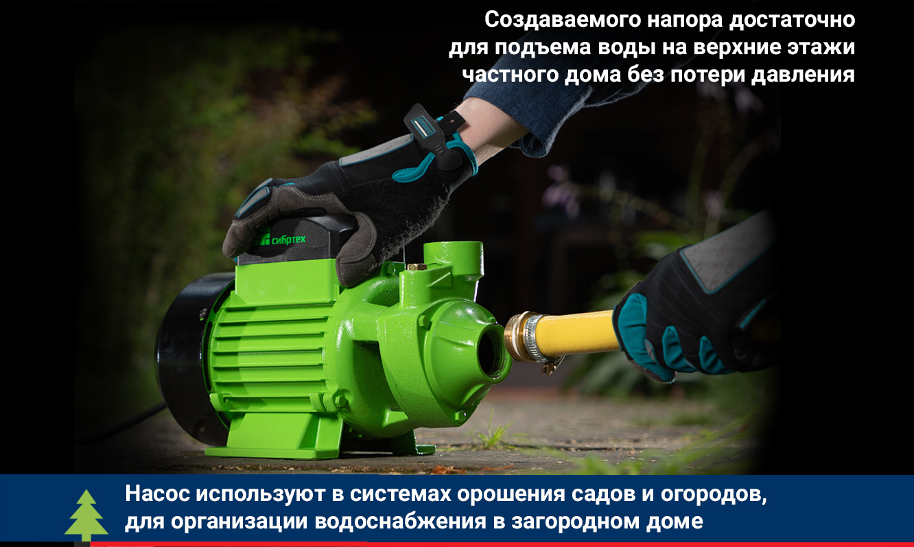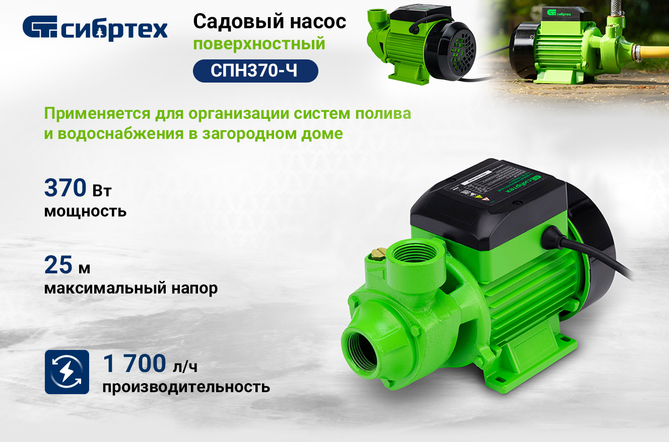 Садовый поверхностный насос СИБРТЕХ СПН370-Ч 97241 подойдет для полива садов, огородов, а также для водоснабжения жилых домов.