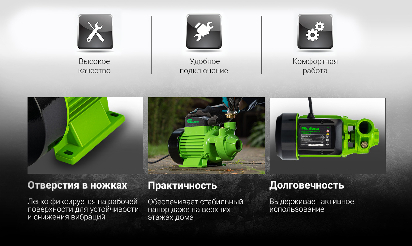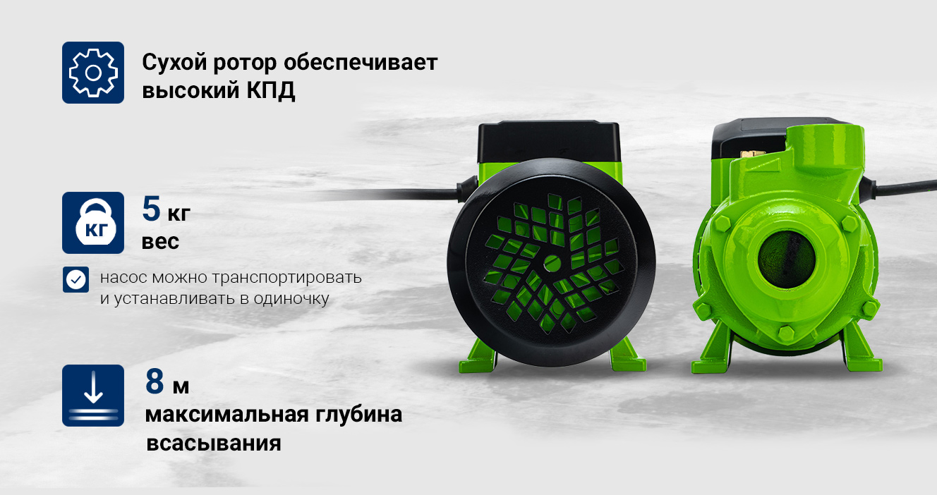Двигатель мощностью 370 Вт способствует подъему воды с глубины 8 метров из открытых водоемов, колодцев и прочих накопительных емкостей.