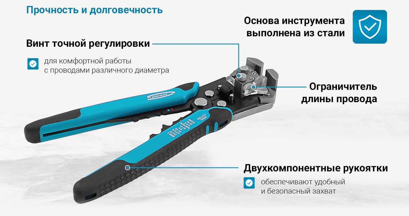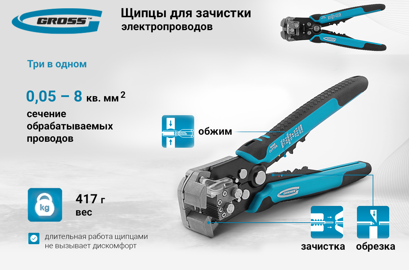 Щипцы для зачистки электропроводов Gross 17718 предназначены для обрезки и зачистки медных и алюминиевых проводов, обжима изолированных и неизолированных клемм, а также одножильных проводов сечением 0,05-8 кв. мм. Позволяют регулировать длину снимаемой изоляции и силу зачистки для работы с проводами разных размеров. Инструмент пригодится для бытового и профессионального выполнения электромонтажных работ.