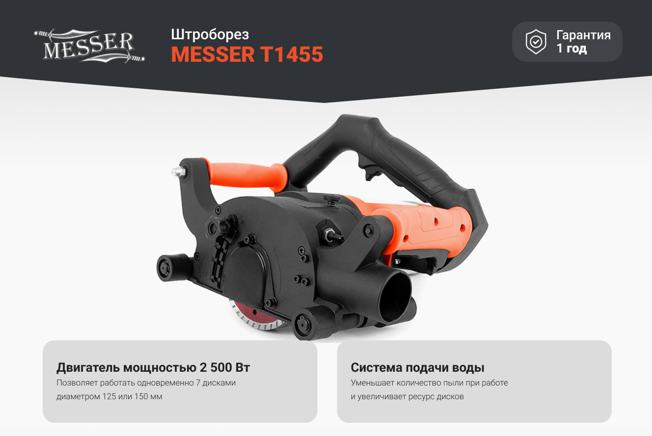 Штроборез MESSER T1455 10-40-145 рассчитан на работу с алмазными дисками диаметром 125 и 150 мм. Его конструкция позволяет установить на вал до 7 дисков, что поможет увеличить производительность и достичь ширины штробы в 38 мм. Штроборез оборудован эффективной системой подачи воды в зону реза, благодаря которой рабочий ресурс дисков значительно увеличивается. Для поддержания чистоты на рабочем месте предусмотрена мощная система пылеудаления.