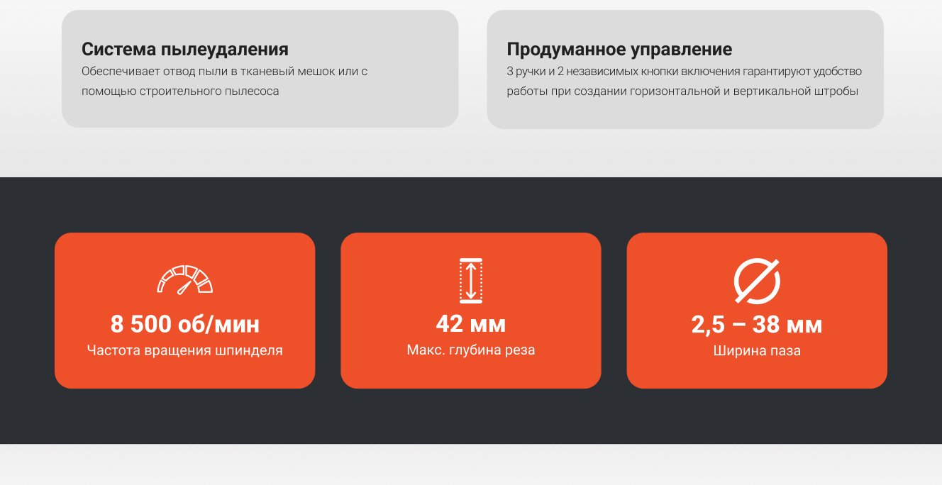 - Регулируемые глубина (0-42 мм) и ширина реза