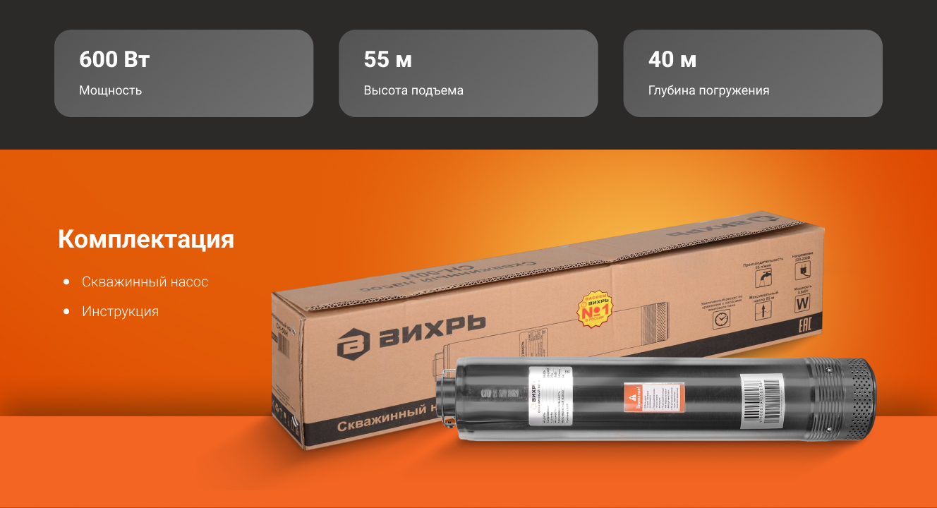 Скважинный насос Вихрь СН-50Н применяется в случаях, когда требуется подача воды со скважины или глубинного резервуара. При этом его категорически запрещено применять для перекачки агрессивных и загрязненных жидкостей. Устройство способно поднимать воду на высоту до 50 м. Погружать насос разрешено на глубину до 40 м. Полезная мощность составляет 600 Вт.