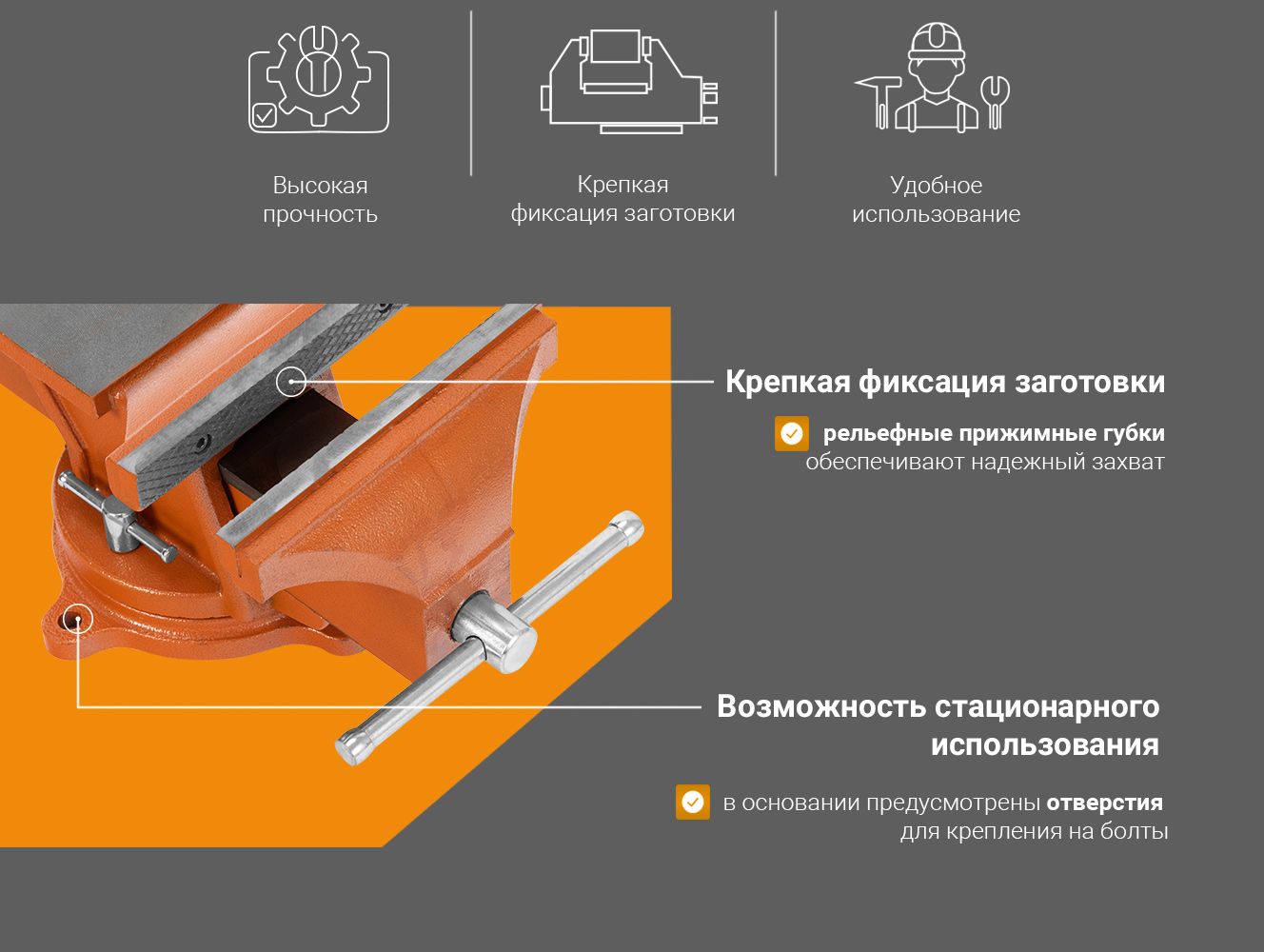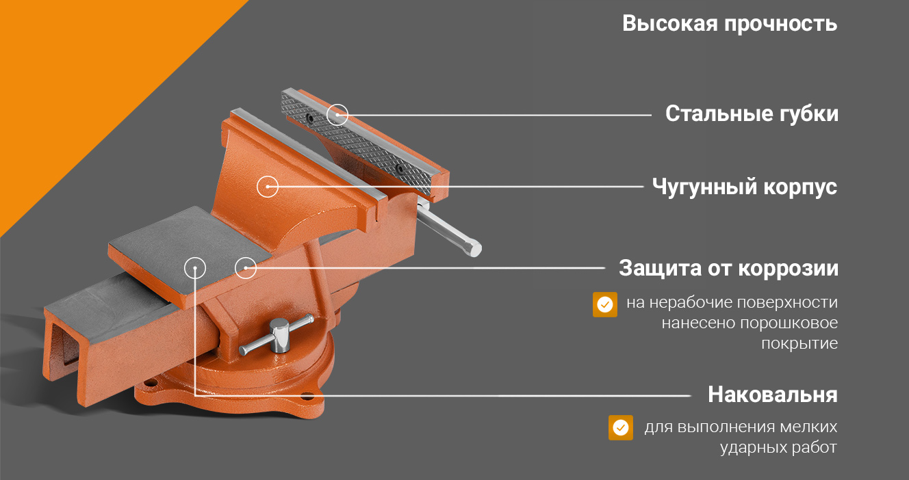- Корпус тисков выполнен из чугуна, а губки — из стали, благодаря чему достигается высокая прочность инструмента