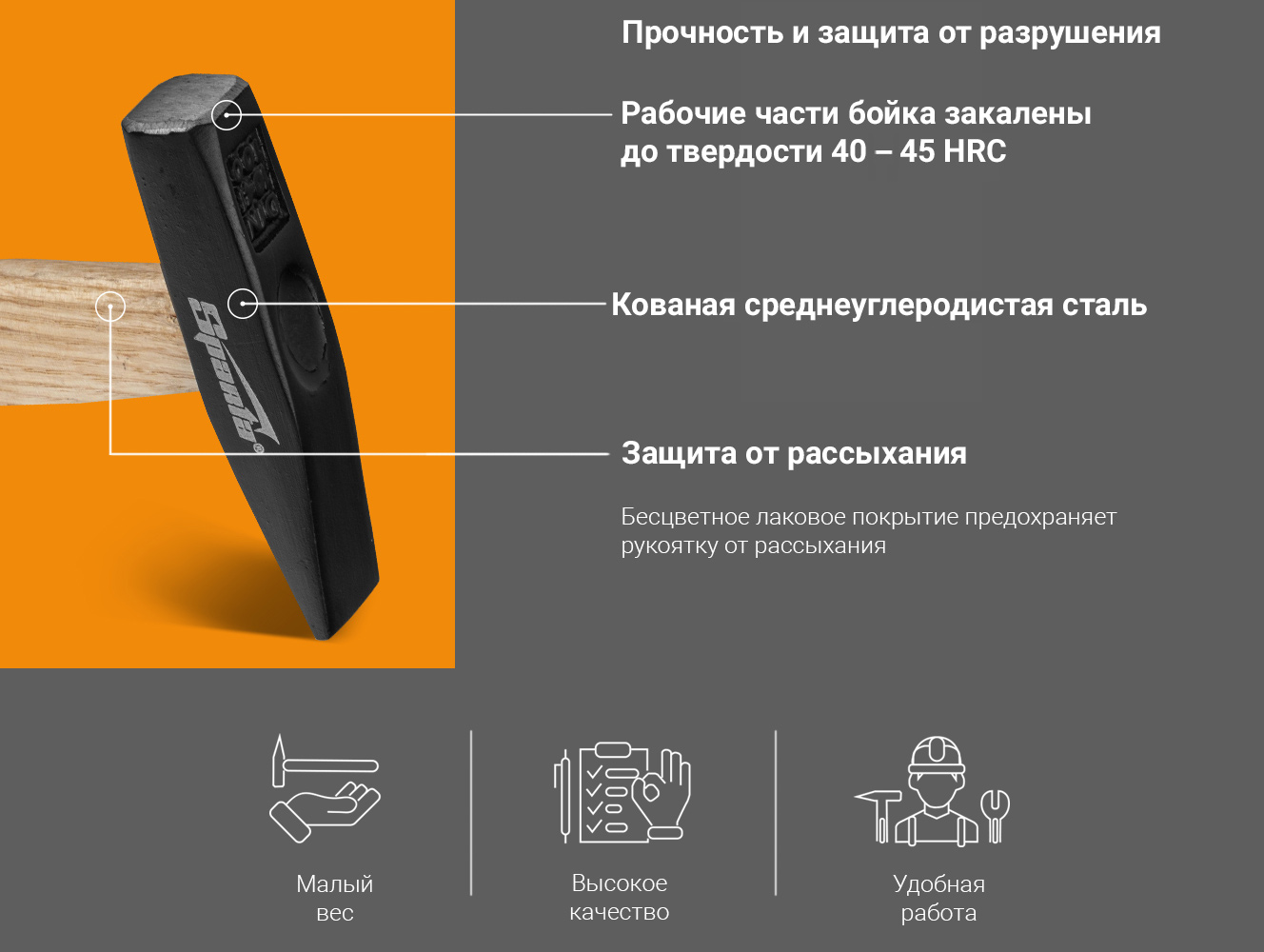 - Прочность — головка изготовлена из среднеуглеродистой стали 45 методом ковки и отфрезерована, рабочие части бойка закалены до твердости 40-45 HRC