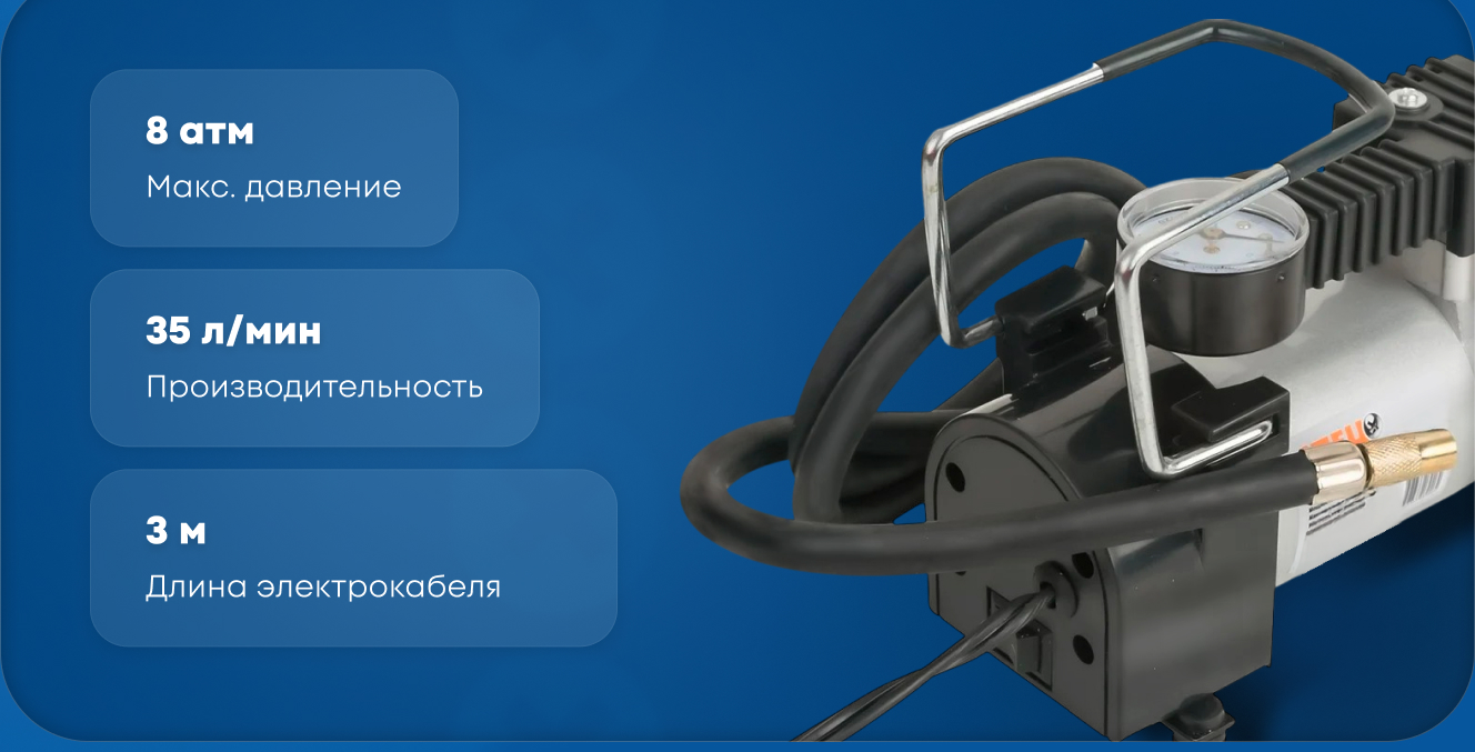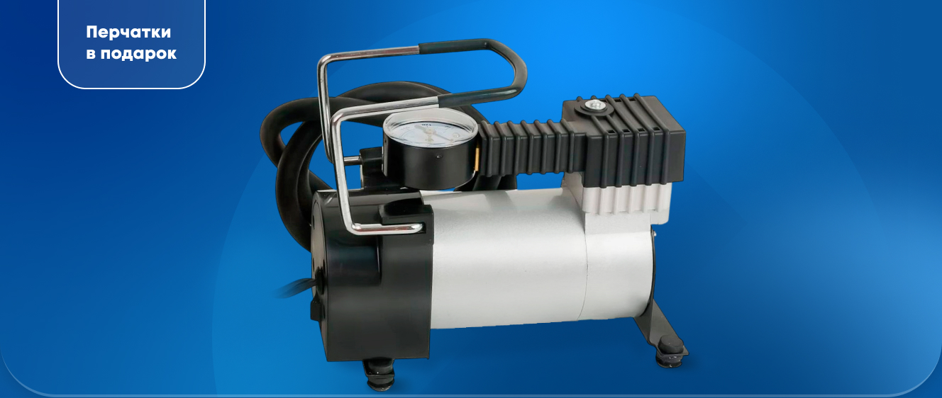 Поршневой автомобильный компрессор Спец КПА-35, 35л/мин, 8 Атм, резиновый шланг 1м, кабель 3,5м, набор насадок, сумка, картонная упаковка + перчатки СПЕЦ-3223/И-8076-И