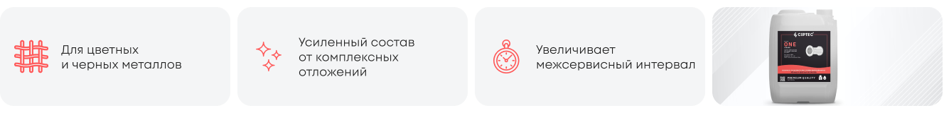 - Уникальная формула В составе присутствую компоненты, которые значительно повышают проникающую способность реагента в отложения, что сокращает время очистки