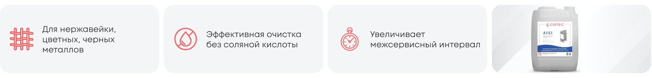 CIPTEC AISI - профессиональный реагент для безразборной и разборной промывки пластинчатых теплообменников, котлов, систем отопления, бойлеров, водонагревателей, чиллеров, конденсаторов выполненных из нержавеющих металлов и сплавов от сложносоставных минеральных отложений накипи, ржавчины.