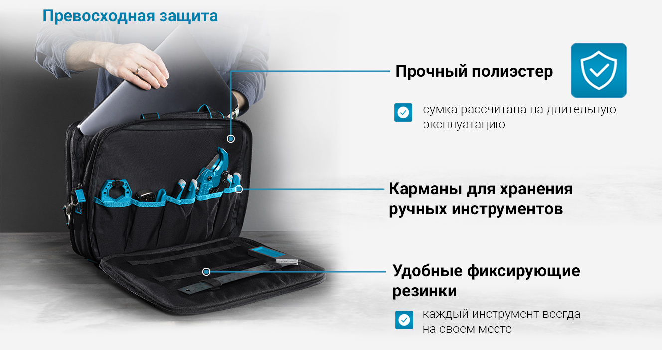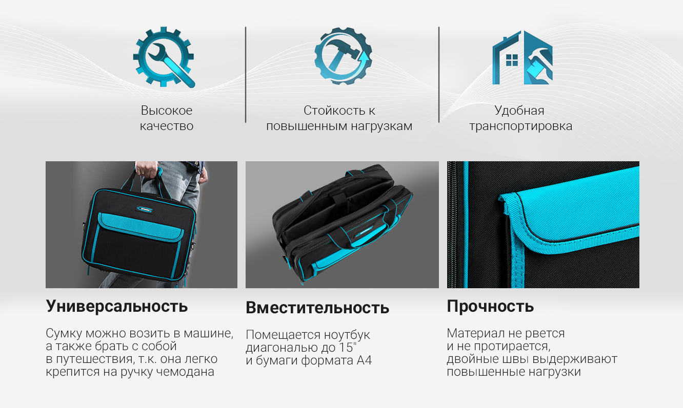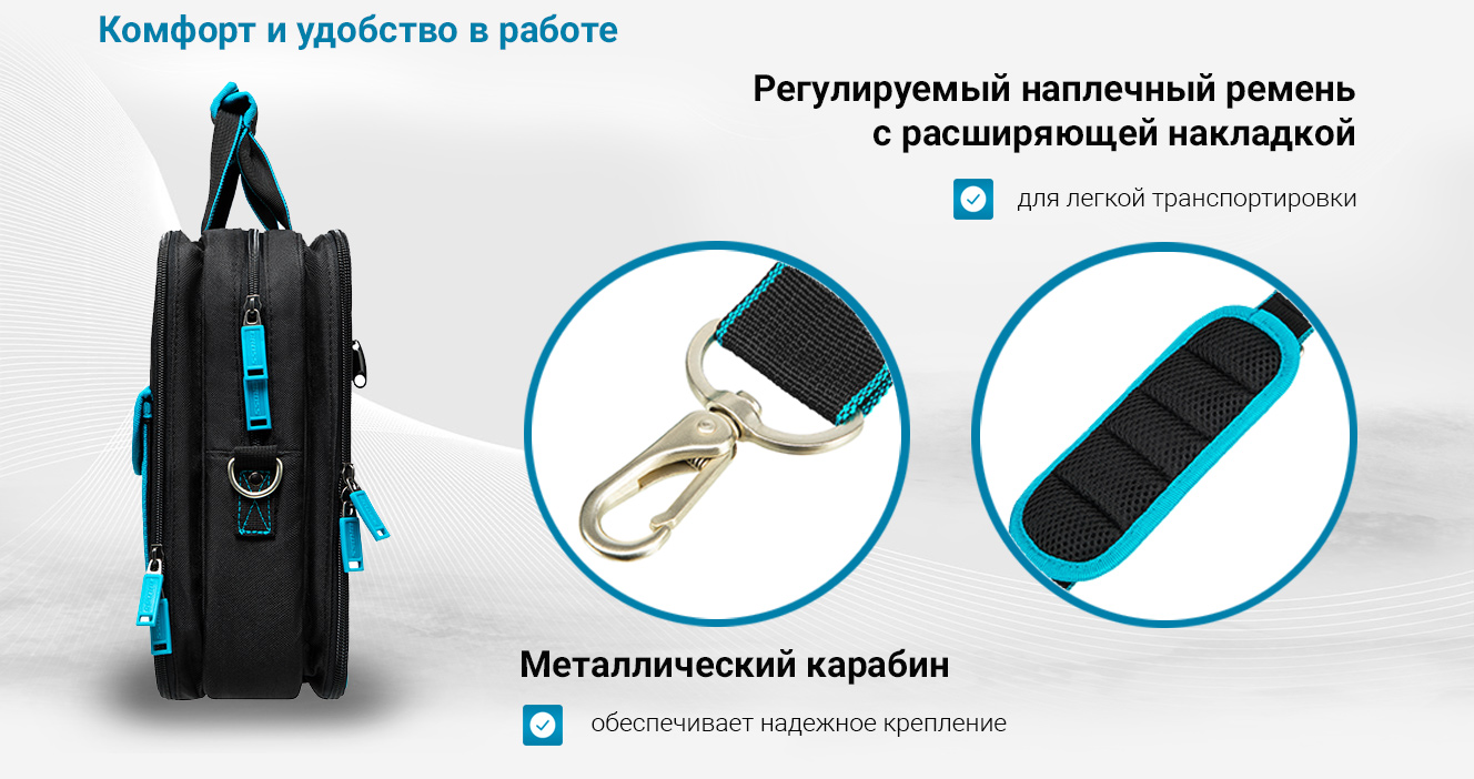 Сумка Gross Meister 90271, 400 х 170 х 300 мм, 31 карман, с отсеком для ноутбука и наплечным ремнем, удобна для переноски и хранения ручных инструментов. Подойдет мастерам по ремонту техники, слесарям, электрикам. Сумку можно брать в офис — в ней помещается ноутбук диагональю до 15 дюймов и бумаги формата А4. В сумке 31 карман и удобные фиксирующие резинки, поэтому каждый инструмент в ней всегда на своем месте.