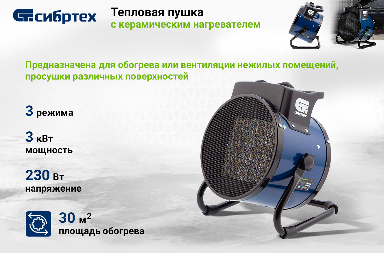 Тепловая пушка СИБРТЕХ керамический нагреватель K3, 3 режима, 230В, 1500/3000 Вт 96404 позволит быстро обогреть помещения до 40 м2, дистанционно просушить поверхность после отделки (оштукатуренные и окрашенные стены, стяжки). А в жару можно использовать её в режиме вентиляции для проветривания. Благодаря керамическому нагревательному элементу тепловую пушку можно использовать в помещениях с людьми и животными, т.к. он не сушит воздух и не выделяет вредных веществ.
