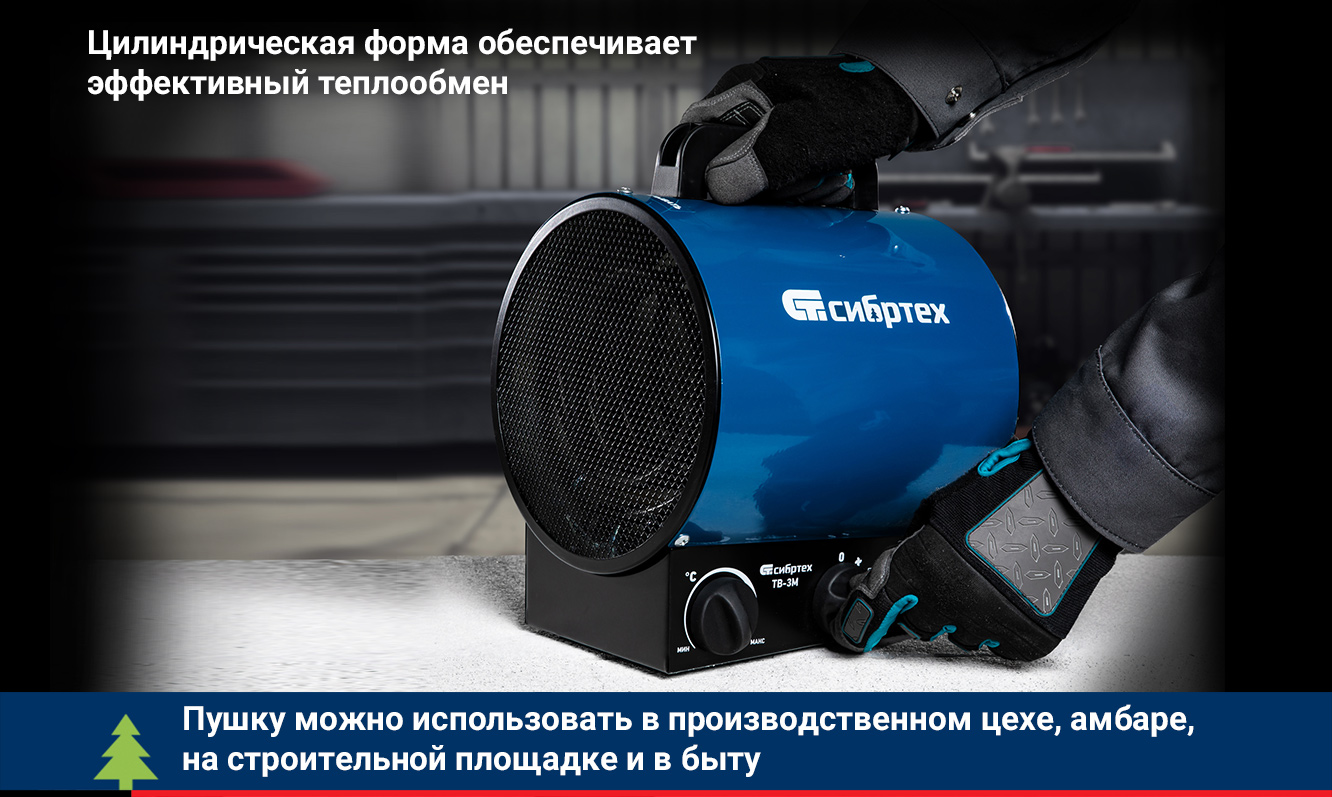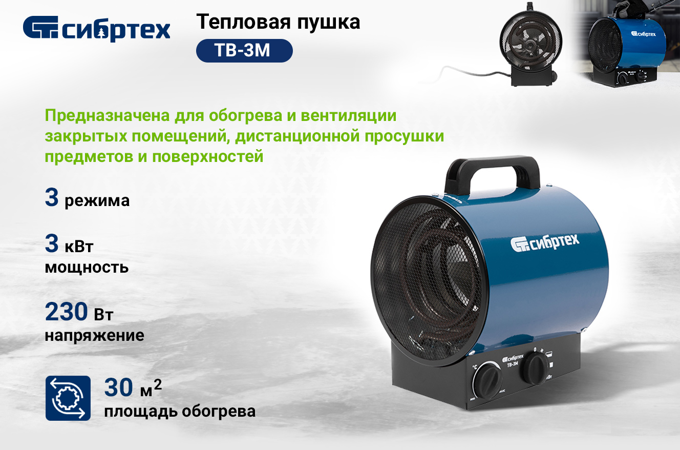 Тепловая пушка (тепловентилятор) Сибртех ТВ-3М 96437 питается от сети 230 В и работает в 3 режимах: вентилятор, нагрев на мощности 1500 и 3000 Вт. Предназначена для обогрева и вентиляции закрытых помещений площадью до 30 кв. м, а также дистанционной просушки предметов и поверхностей. В качестве нагревателя используется надежный круглый ТЭН из нержавеющей стали. Тепловентилятор можно использовать в производственном цехе, амбаре и на строительной площадке, а также в быту.
