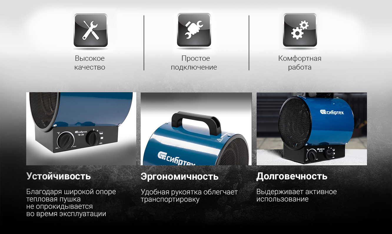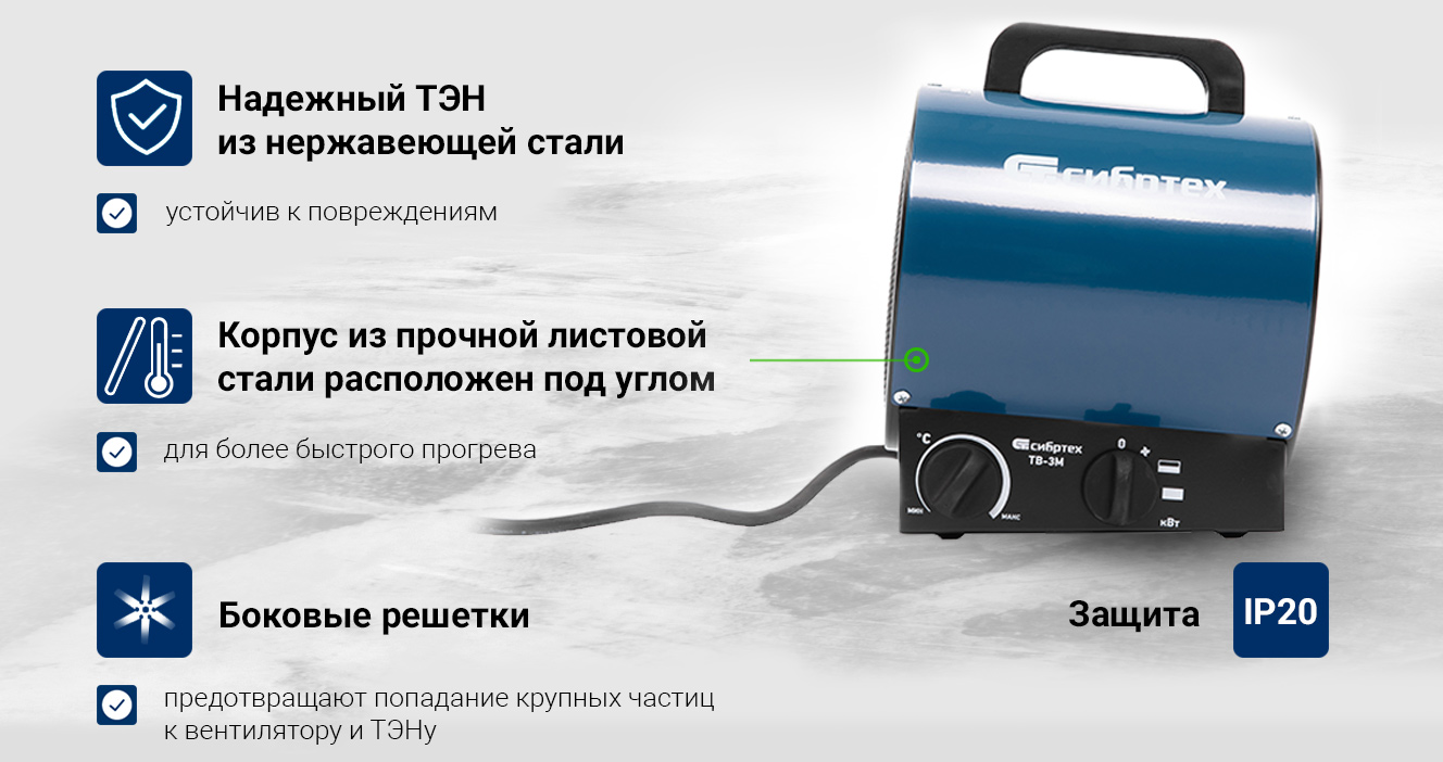Преимущества СИБРТЕХ ТВ-3М тепловентилятор, 230 В, 3 реж. вентилятор, 1500/3000 Вт