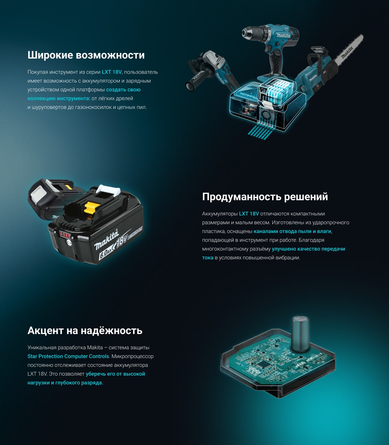 1) DGA504 – полноценная замена по мощности и практически всем возможностям сетевой УШМ средней мощности с кругом на 125 мм 2) Бесщёточный мотор: отсутствие искр, выше КПД, нет нужды менять щётки, компактный размер при высокой мощности, умная управляющая электроника 3) В комплекте сразу всё что нужно для работы: УШМ, аккумулятор, кейс и зарядное устройство (к тому же быстрое – около 20-25 мин на аккумулятор 3 а/ч) 4) Удобный хват и отличная развесовка с установленным аккумулятором 5) Самая доступная цена среди брендовых бесщёточных УШМ с подобной комплектацией 6) Очень хорошая защита от заклинивания диска и перегрузки – даже при резком заклинивании при отрезных работах, как правило, максимум просто отлетает небольшой кусочек диска. Кроме того, есть защита от запуска при смене аккумулятора (если оставить клавишу пуска включённой и при этом вставить аккумулятор, инструмент не запустится) и защита от перегрева 7) Автоматическая регулировка скорости и крутящего момента, которая включается при превышении определённой нагрузки (например, резка алмазным отрезным кругом на полную глубину, когда добавляется трение боковых стенок круга), обороты при этом снижаются, но повышается крутящий момент 8) Повышенная защита от пыли и влаги - XPT 9) Удобная обрезиненная боковая рукоятка 10) Кожух имеет систему быстрой фиксации – нужно лишь предварительно отрегулировать требуемую силу сжатия винтом 11) Плавный пуск 12) В сравнении со стандартными сетевыми УШМ заметно ниже уровень звукового давления (79 дБ против 85 дБ) 13) Есть информативная индикация состояния УШМ: индикатор уровня заряда аккумулятора (три прямоугольных светодиода, располагаются над местом крепления аккумулятора), также показывающий нештатные ситуации (перегрев и защитная блокировка, включающаяся при нескольких срабатываниях защиты подряд) и индикатор перехода в режим повышенного крутящего момента (круглый светодиод, располагается рядом) 14) УШМ входит в линейку Makita LXT – это более 300 видов инструмента на одном типе аккумуляторов 15) Развитая сеть сервисных центров