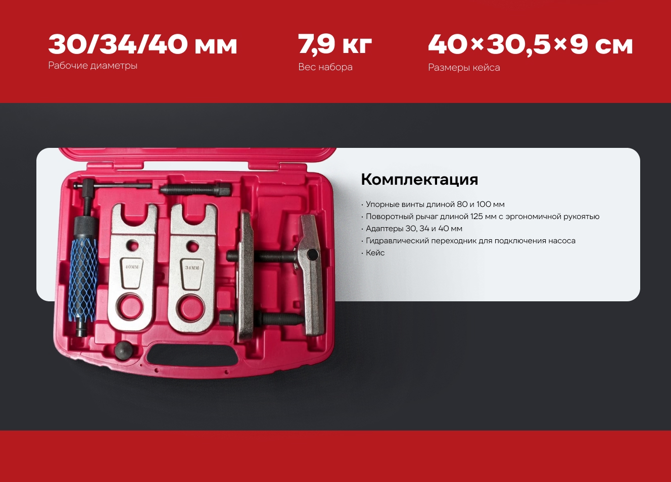Универсальный гидравлический набор инструментов 12т для снятия шаровых шарниров 6шт JTC-4075 служит для демонтажа наконечников поперечной рулевой тяги, стабилизатора, поперечной устойчивости и шаровых опор. Может использоваться как вручную, так и при помощи гидравлического привода для грузовых автомобилей до 12 тонн - для этого в комплекте предусмотрен специализированный адаптер. Рабочий диапазон: 30, 34, 40 мм. Длина упорного винта: 100, 80 мм. Длина поворотного рычага: 125 мм.