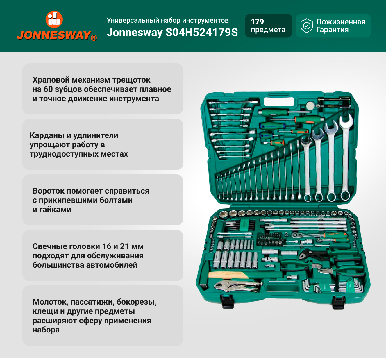Универсальный набор инструмента Jonnesway S04H524179S 1/4", 1/2"DR, 179 предметов 046757