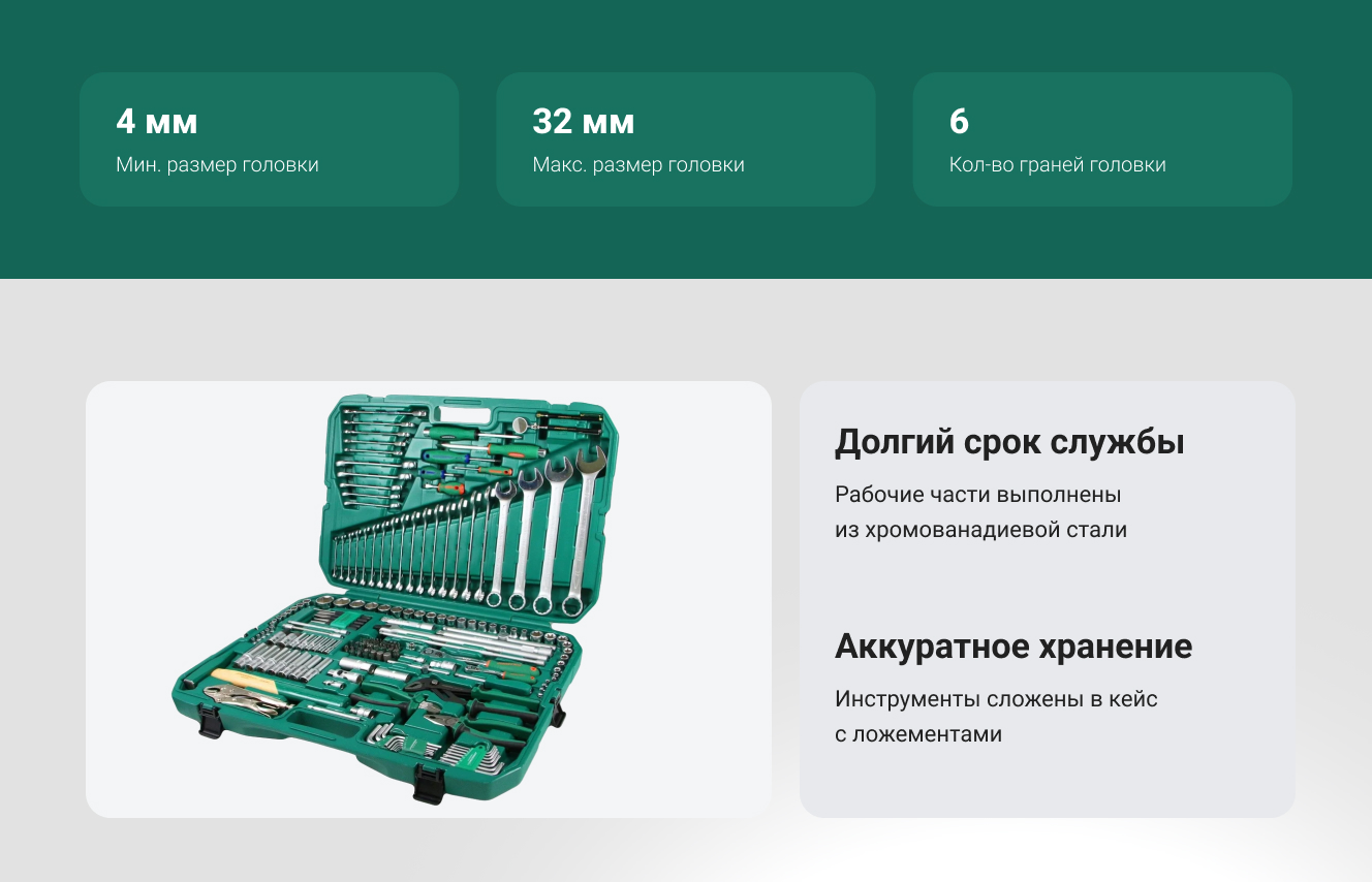 Состав набора , крепкий кейс, отличные трещотки, внешний вид инструмента.