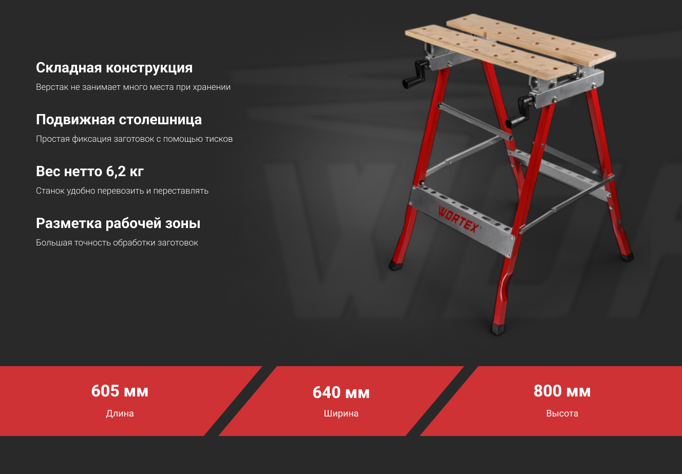 Верстак складной WORTEX WB 1060 бамбук, 605x640x800 мм, регулировка столешницы 1334743