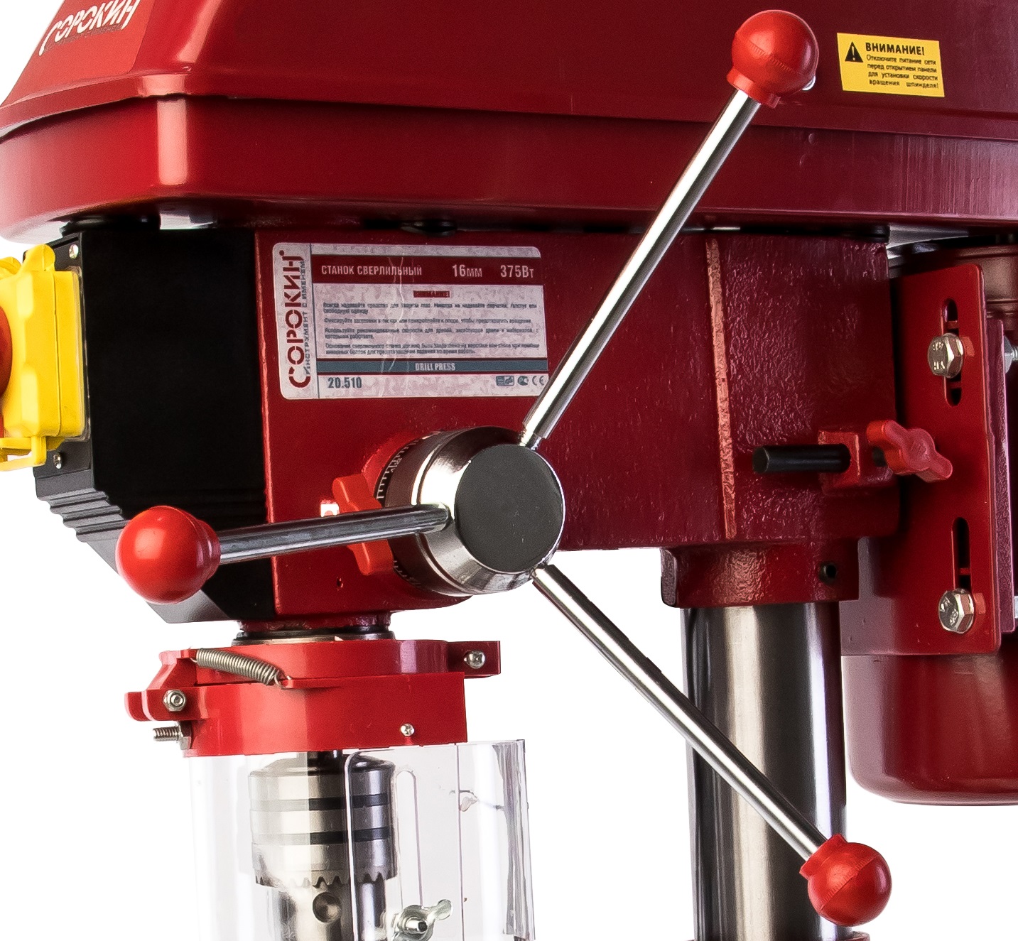 Безопасность Защитный экран вертикально-сверлильного станка СОРОКИН 20.510 делает работу безопасней для оператора, исключая вылет стружки. |