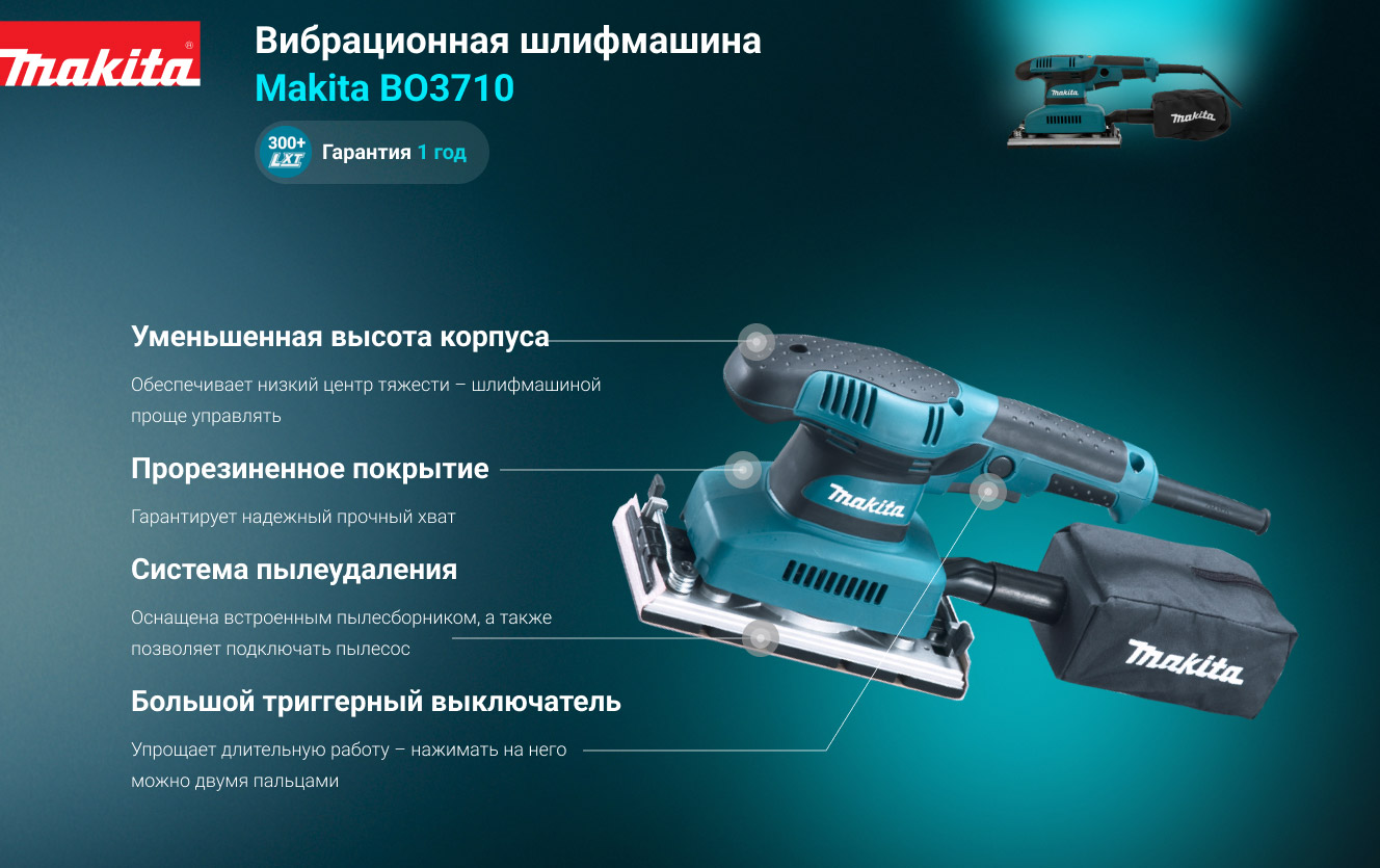 Удобный хват Прорезиненная рукоятка - для уверенного комфортного удержания вибрационной шлифмашины Makita BO3710. |