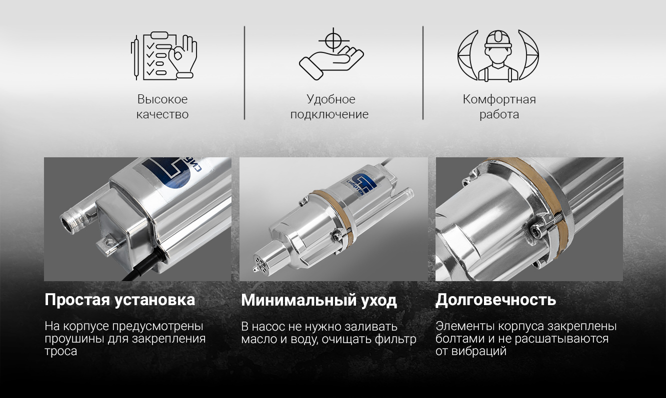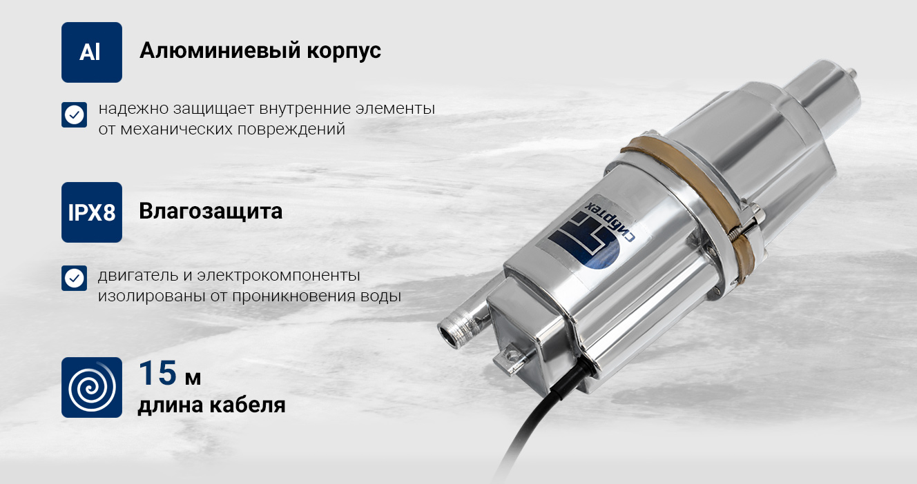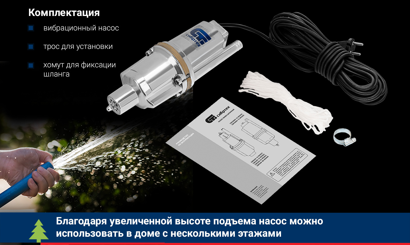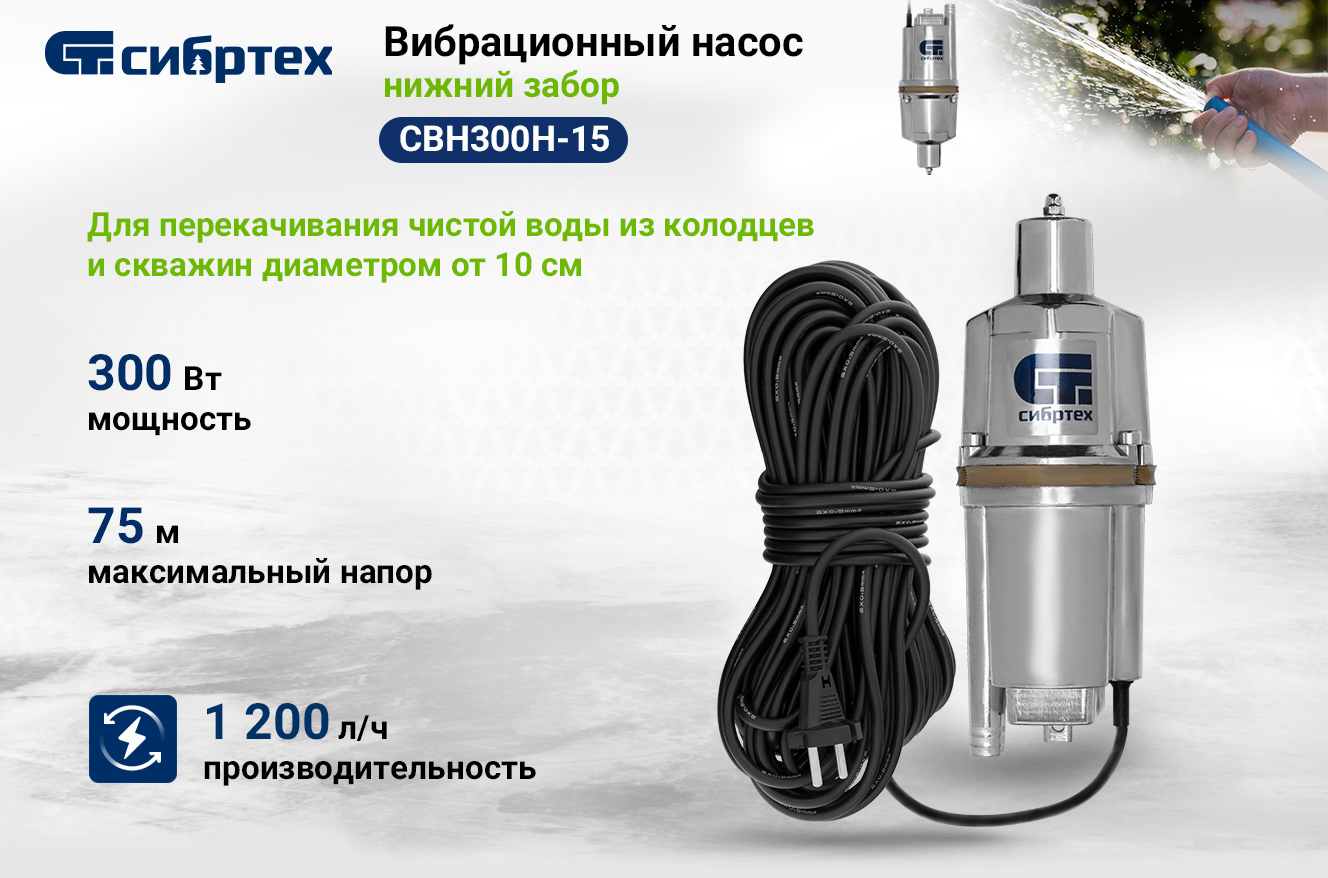 Вибрационный насос СИБРТЕХ СВН300Н-15 кабель 15 м 99306 используется для подачи воды из колодца и скважин, а также подходит для перекачивания чистой и пресной воды.