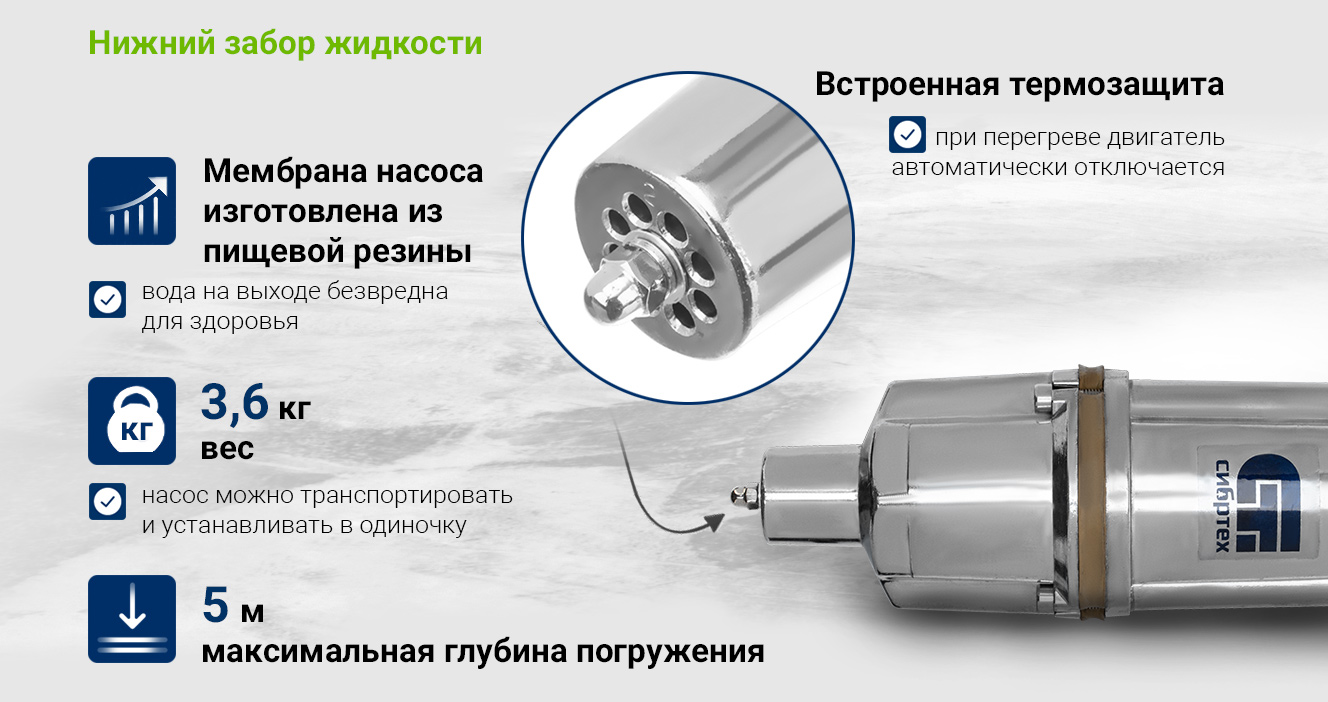 Благодаря нижнему забору воды, насос способен откачивать воду до минимального уровня.