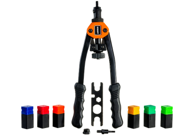 - Заметные детали Яркий заклепочник и разноцветные насадки не потеряются среди прочих инструментов
