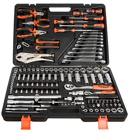 - Только самое нужное В наборе трещоточный и шестигранные ключи, головки и воротки, удлинители, свечные головки