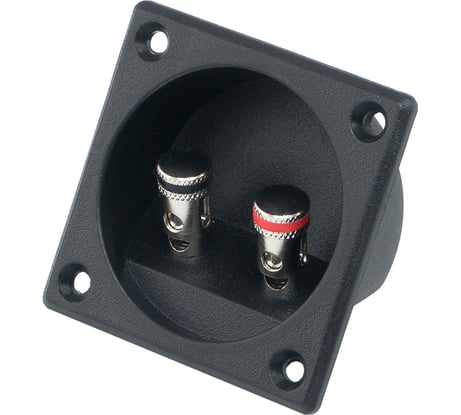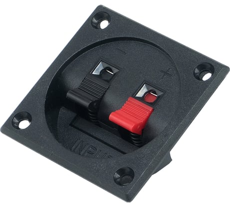 Хороший терминал для больших колонок. Китай среднего уровня. Изолирован от давления нч-динамика, как и положено. Даже прокладка по контуру есть. Пружины крепкие, прижим хороший. Контакты хлипковаты для клемм, скорее под пайку. Крепление на шурупах удобнее врезного несъемного.