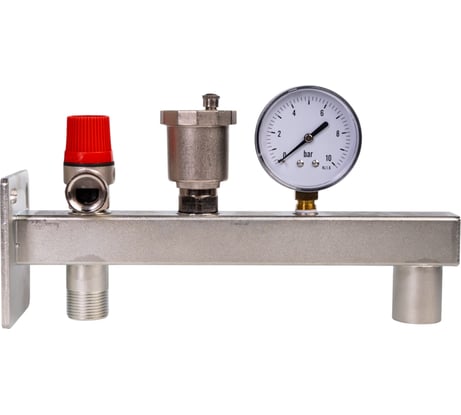 Брал такую группу безопасности. Клапан, манометр и воздухоотводчик на месте, резьбы чёткие, уплотнения держат. Работает, течей нет.