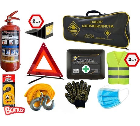 В целом набор выглядит хорошо. В нём есть огнетушитель, знак аварийной остановки, жилетка, противооткатный упор - одна штука, перчатки, аптечка и даже ароматизатор с забавной физиономией. Но вот к составу аптечки есть некоторые нарекания. Он не соответствует составу утвержденному в приказе Минздрава России от 08.10.2020 N 1080н "Об утверждении требований к комплектации медицинскими изделиями аптечки для оказания первой помощи пострадавшим в дорожно-транспортных происшествиях (автомобильной)"