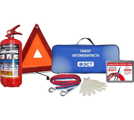Набор укомплектован строго по регламенту: аптечка, огнетушитель и знак есть. Качество материалов стандартное, соответствует своей цене. Для прохождения техосмотра или в качестве недорогого базового варианта вполне подойдет. Ничего лишнего.