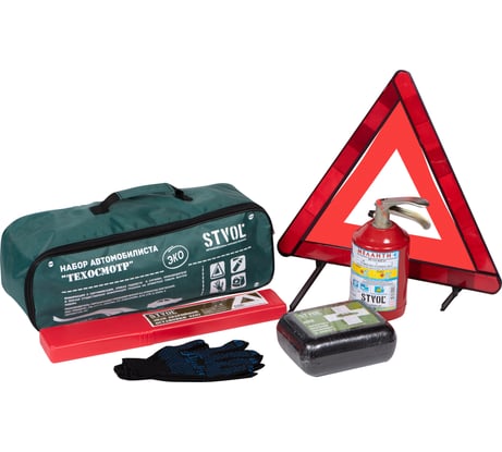 Аптечка плотно набитая (есть всё необходимое и даже больше) знак аварийной остановки, светоотражающий жилет, добротный огнетушитель и даже перчатки не поленились положить (мелочь, а приятно). Всё это упаковано в хорошую сумку.