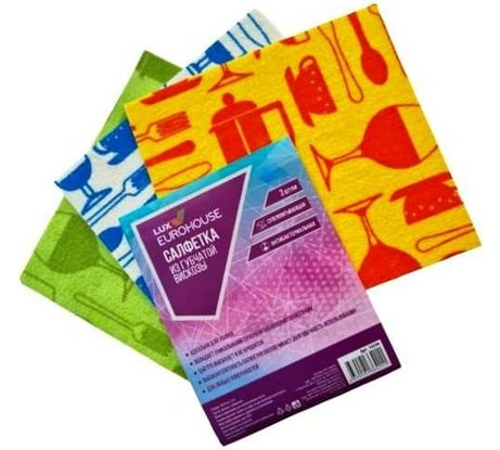 Удобная упаковка.Свои основные функции салфетка выполняет, несмотря на невзрачный вид - краска блеклая, обработка краев выполнена ниткой за все цепляющейся.