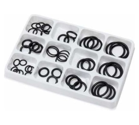 Резина колец пластичная, в меру твердая и упругая. Кейсик с отделениями. Лист с указанием комплектации. Один из размеров подошёл даже к изливу кухонного рычажного смесителя.