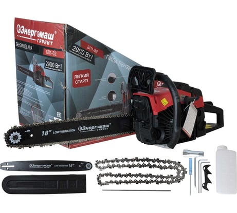 Приколько что марка Sturm выпускается под брендом Энергомаш))) Пилит кстати здорово! Тяжеленькая, но доволно мощная пила! Понравилось что в комплекте идёт описание, напильник, свечной ключ и бумага по эксплуатации и вид запчастей.