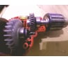 При таком конструктиве масса без шнура 1.2кг. Двуступенчатая редукция, хотя после вскрытия становится ясно, что обороты можно было сделать еще ниже. Шпиндель сзади во втулке, промежуточный вал спереди в шариковом подшипнике, сзади иголки. Передний подшипник шпинделя установлен изнутри, но вполне серьезно зафиксирован стопорным кольцом. Кроме саморезов, нет дополнительной фиксации проворачивания частей корпуса редуктора друг относительно друга. Патрон накручен через шайбу, иначе почти садится на мордочку. Посадка 3/8, сам пока без нареканий. С хватом ясно, поскольку щетки расположены сверху и снизу. По совокупности улик дрелька если не уникальная, то, по крайней мере, очень толковая.