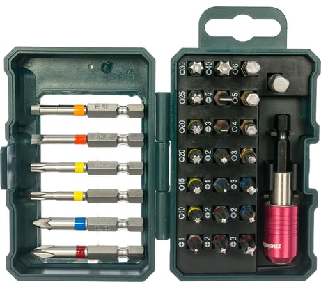 Ну... Не послушался отзывов + цена 749 - купил. На вид отлично всё. Биты хорошие, в масле, так и блестят, по факту - крепкие. А вот битодержатель... На вид хорош, удобен, при осмотре битки хорошо входят и выходят, а на деле - при усилии/нажатии на биту, чтоб не вылетала из саморезов - утапливается в битодержатель, там нет упора, пружинка под магнитом, которая выталкивает биту и все, чуть надавил на биту и она двигается в глубь, продавливает фиксирующий шар, без движения внешнего кольца, соответственно, которое, по итогу, клинит и бита застревает там намертво. Приходится расшатывать/вибрировать/постукивать, чтоб она вышла в стандартное положение, после чего можно её изъять. В общем, битодержатель планировал использовать обычный, и так и буду. Но Метабо, могли бы в набор положить хороший битодержатель, обычный, хороший, ровный, а не вот эту клинящую, кривую китайщину. За эти деньги можно взять несколько ноунейм наборов бит, которые прослужит столько же, которые будет не жалко выкинуть/заменить. Цена за бренд, не доволен качеством, не рекомендую.