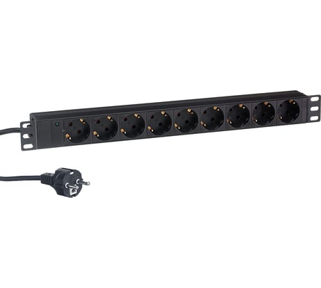 Недорогой черный PDU со светящимся выключателем и защитной крышкой. Сзади разъем С14 в который удобно вставлять шнур питания, в отличие от многих Hyperline'овских PDU, в которых шнур торчит вбок и упирается в крепежный профиль.