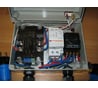 Устройство плавного пуска на 3kw для запуска фекального насоса на 2.5kw (Quattro Elementi Sewage 2500 F Ci) решено было включать с применением реле с пультом на 30А, но веры в то что оно будет держать такую нагрузку не было, поэтому в сборку включил контактор ("Texenergo" 32A). Все соединения выполнены проводом 2.5 мм² (кроме сигнальной неоновой лампы). Бокс "Stekker" на 8 модулей, вилка с розеткой "Bals". Пришлось повозиться с закреплением всех элементов (использовал 3мм алюминиевую пластину). Работает нормально.