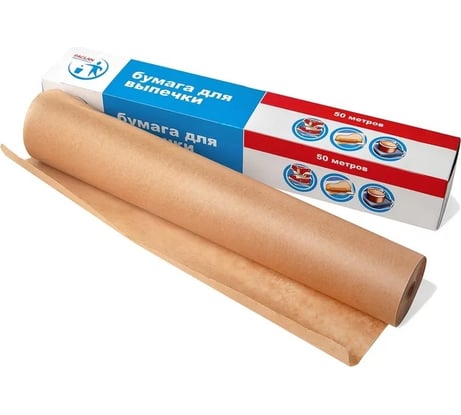Рулон упакован в пленку, но хотя бы без каких-либо повреждений - даже края не замяты. Жаль, что не в картоне с ножом, пришлось запихивать в свою старую коробку, предназначенную для 8м рулона, но даже в него этот 50м рулон кое-как влез, что дополнительно говорит о малой толщине бумаге. Присутствует силиконовое покрытие. Обычная выпечка отстает от бумаги нормально. Если не очень жирная или сахарная, то листы вполне можно повторно использовать, но я бы оценил лимит - 2-3 раза повторного использования. Произведена в Китае.