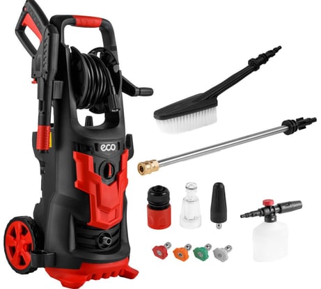 Мойка ECO HPW-2027RSW с пеной 1000 мл, давление 200 бар, шланг 8 м — для дачи купил, машину от глины отмыл за пять минут, патрубок крутит струю как насос! Сначала не разобрался с шланга. Тяжелая 18 кг, катить неудобно по траве, вчера колеса в грязи застряли, а мощность 2700 Вт.